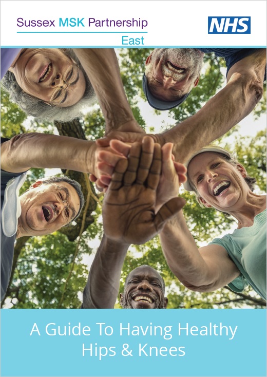 A Guide to Having Healthy Hips & Knees front cover. Five people look down at the camera, holding their hands together one on top of the next, in the middle of a circle.