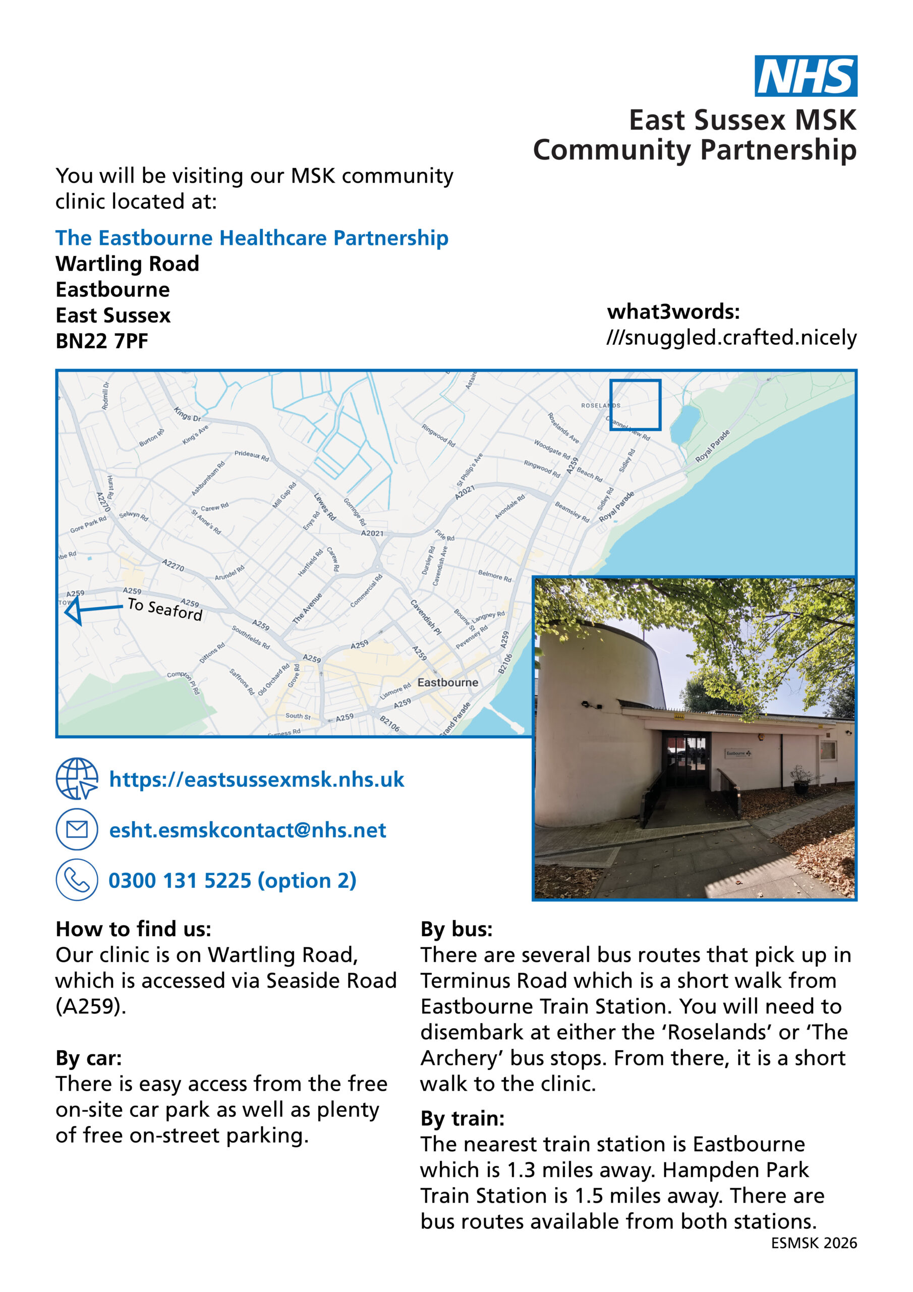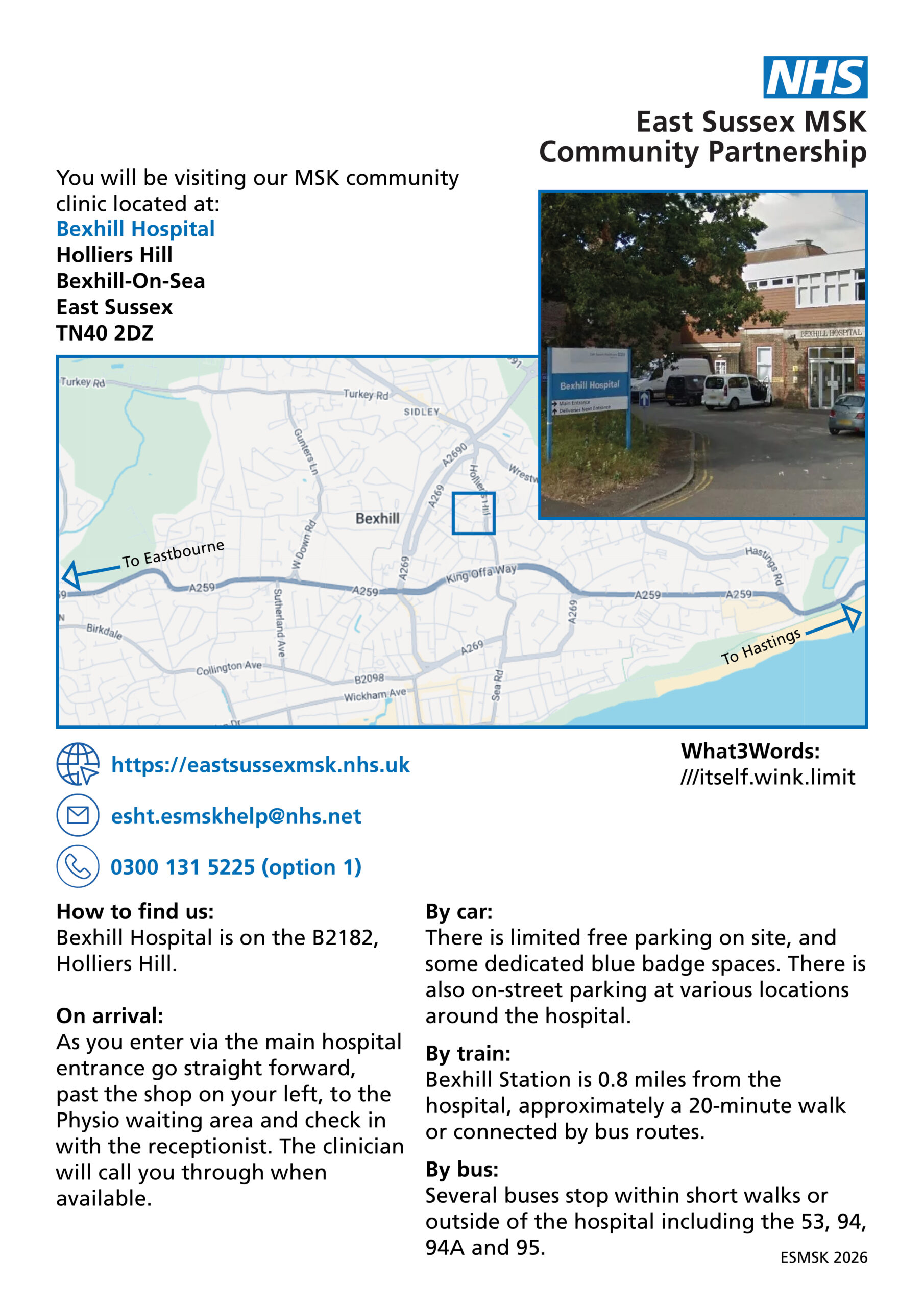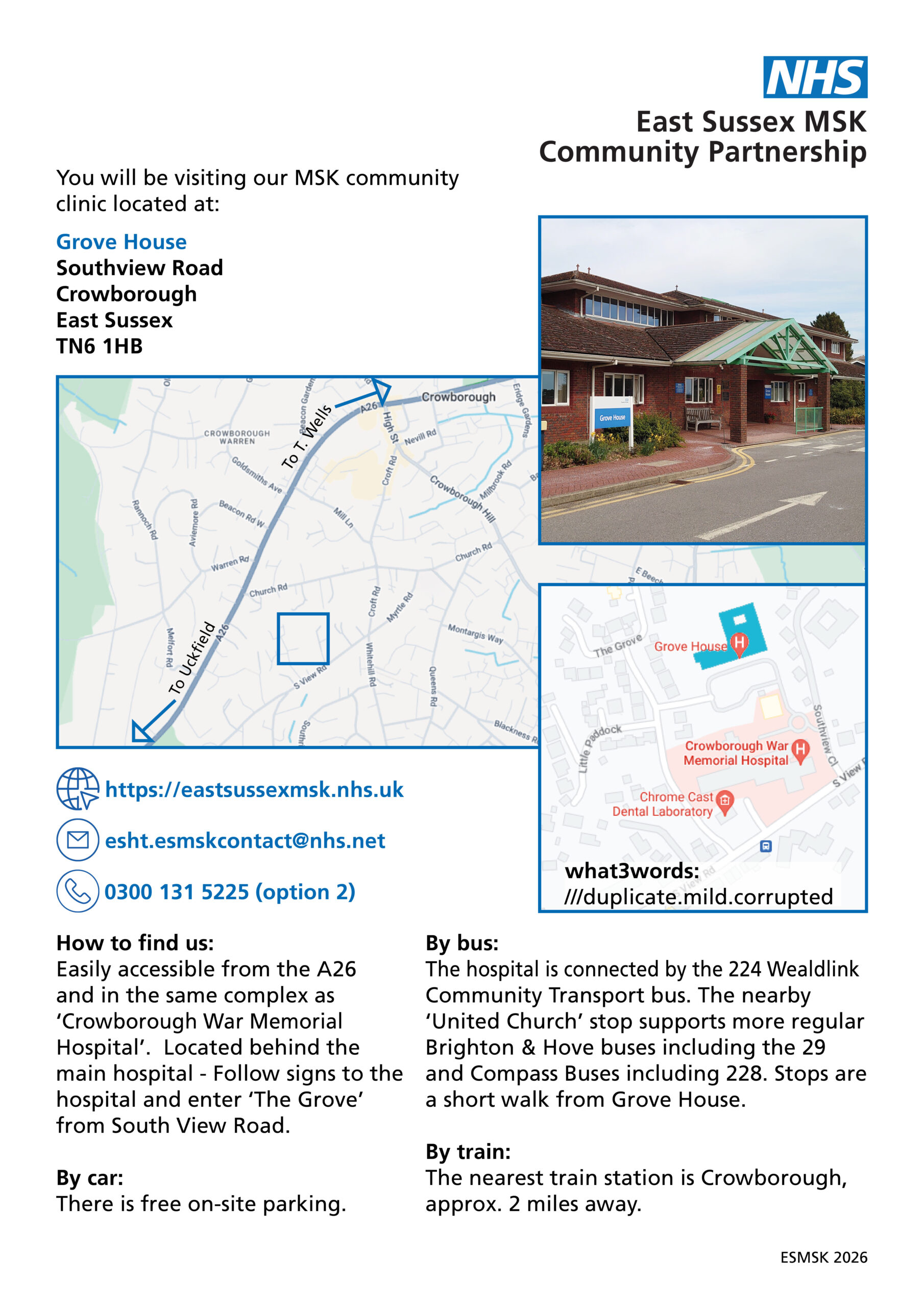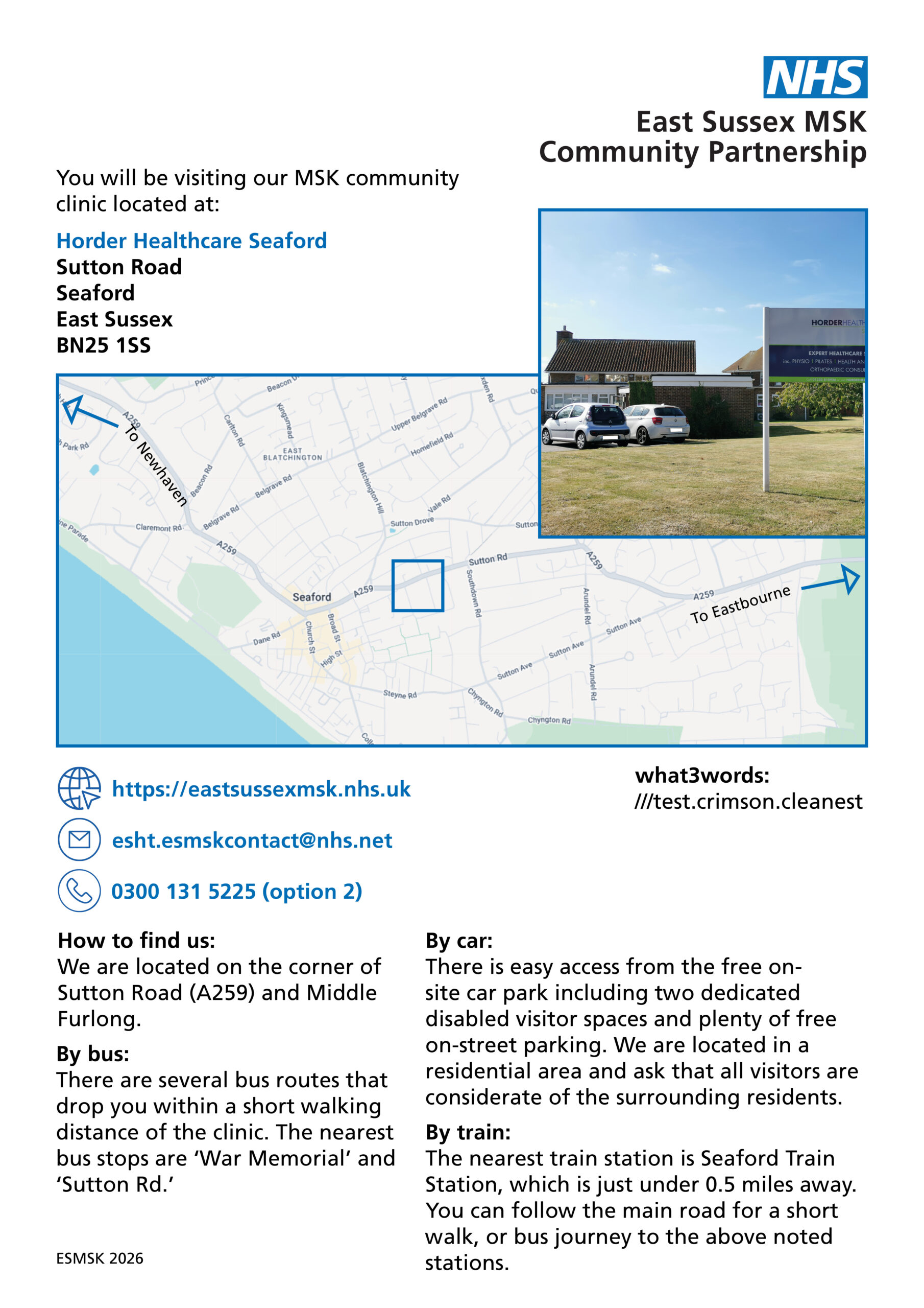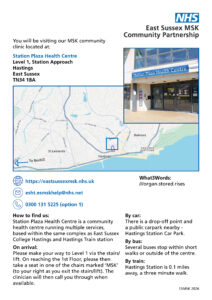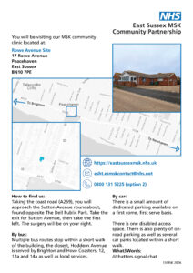 We deliver specialist MSK services from community clinics and through local physiotherapy providers across East Sussex. In some areas, these services are based in the same buildings, which can sometimes cause confusion.